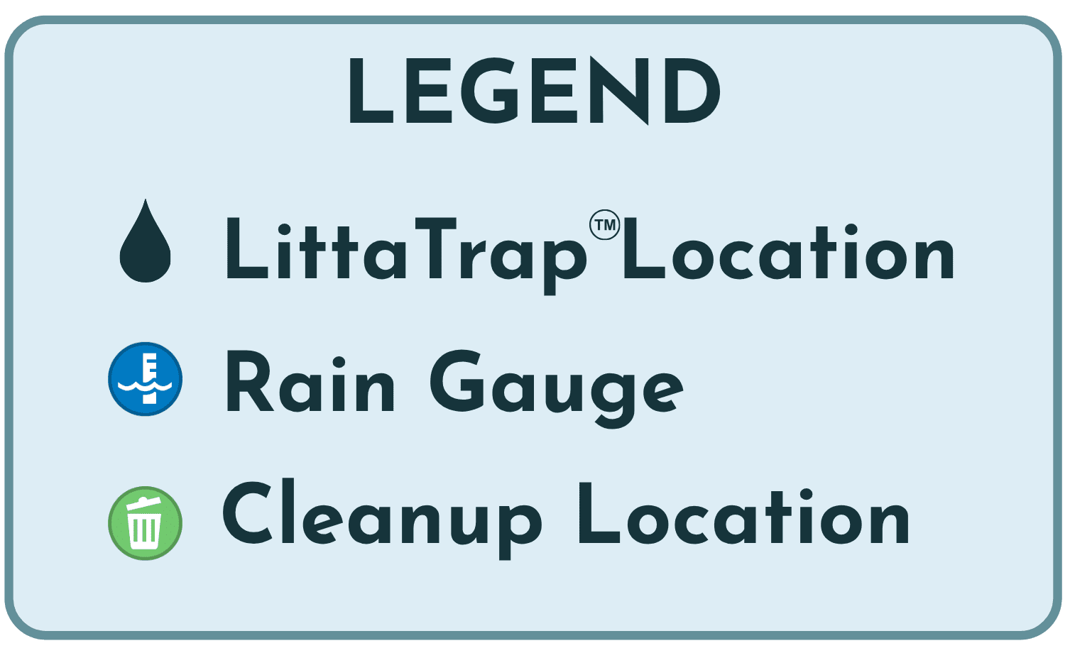 On the map: To zoom to a specific area, LittaTrap™, or clean-up event, zoom using your mouse or the +/- buttons in the bottom right corner. The water drops are areas where LittaTraps™ are installed and actively monitored and trash cans represent community clean-ups. You can click on each icon to see the results from each LittaTrap™. Use the right-hand toolbar to view the legend, or search for an address. The charts in the top right will update as you explore the map.